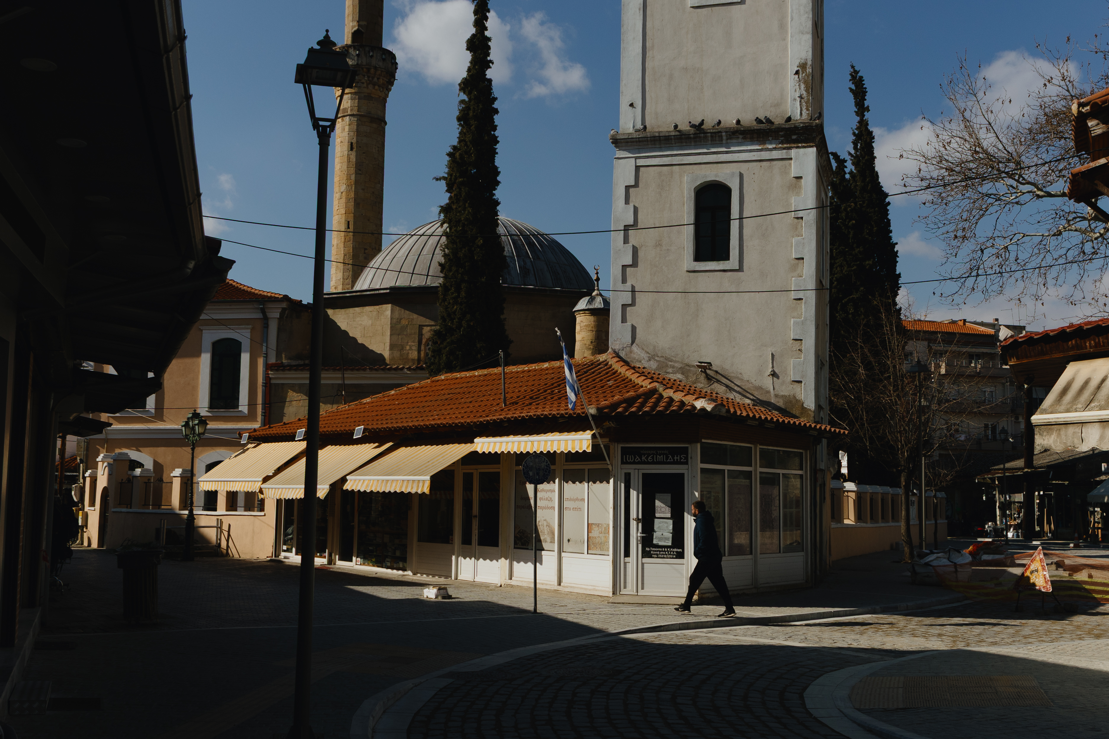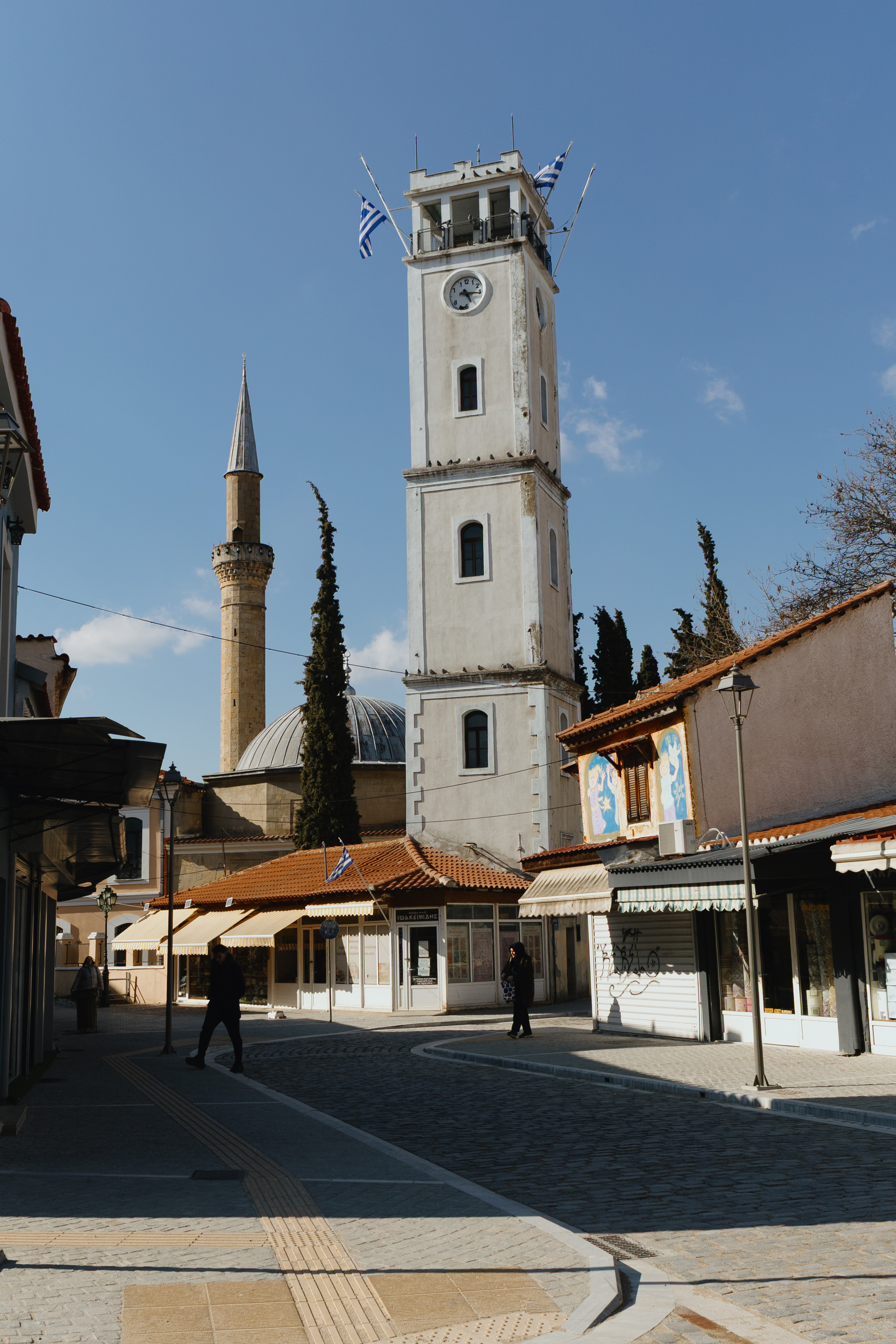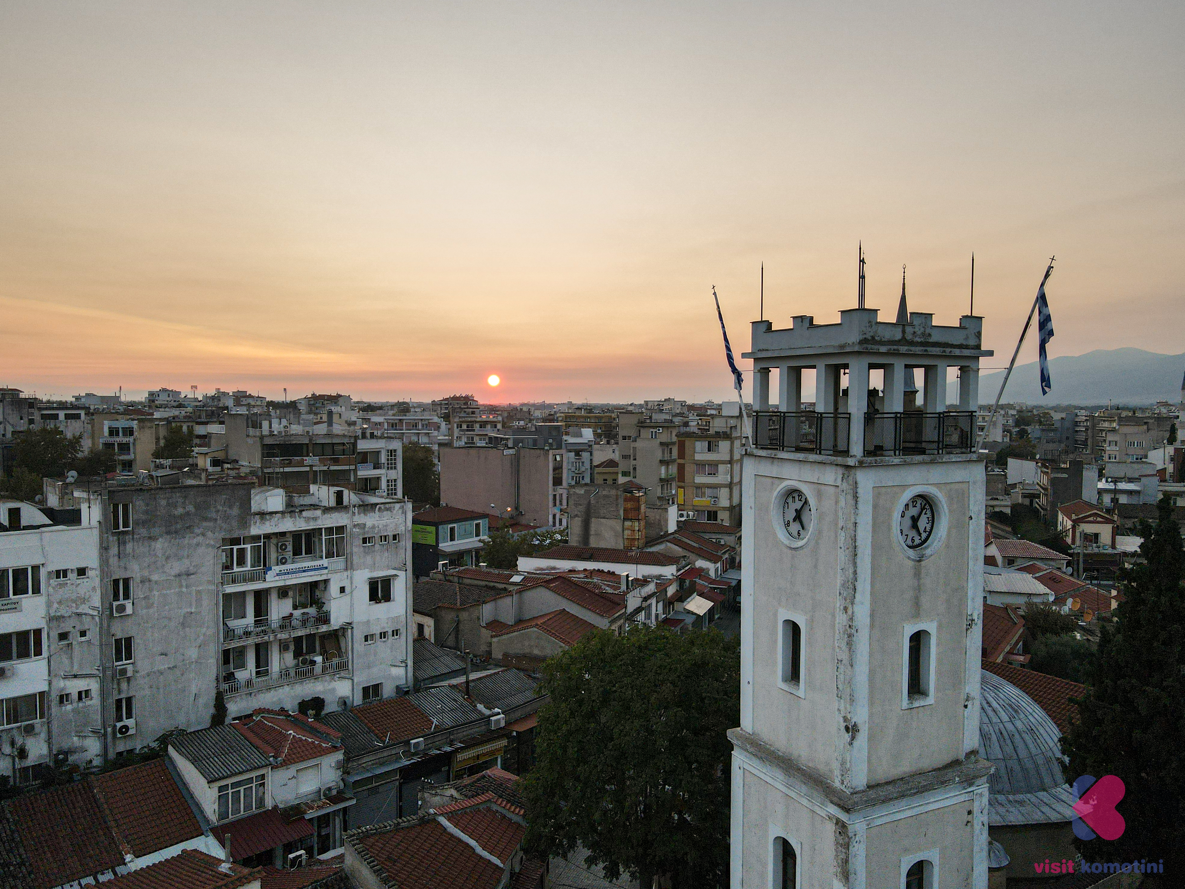 Ο Πύργος του Ωρολογίου χτίστηκε στα 1884, την εποχή του Σουλτάνου Αμπντούλ Χαμίτ του Β΄. Στην δεκαετία του 1950 έγιναν αρχιτεκτονικές επεμβάσεις και πήρε την σημερινή του μορφή. Πίσω από τον πύργο υψώνεται ο μιναρές του τεμένους Γενί Τζαμί, από τον εξώστη του οποίου ο μουεζίνης καλεί τους πιστούς του Ισλάμ στην προσευχή. Στο προαύλιό του στεγάζεται η θρησκευτική αρχή των μουσουλμάνων της Ροδόπης, η Μουφτεία Κομοτηνής. Στην ΝΔ πλευρά του συγκροτήματος πύργου-τεμένους βρίσκεται η πεζοδρομημένη εμπορική οδός Ερμού, ενώ στην ΒΑ πλευρά, στην παραδοσιακή πλατεία του Ηφαίστου, είναι συνωστισμένα τα εργαστήρια του λευκοσιδήρου, τα γνωστά τενεκετζίδικα, που δίνουν ένα μοναδικό χρώμα στην αγορά της πόλης που απλώνεται τριγύρω.